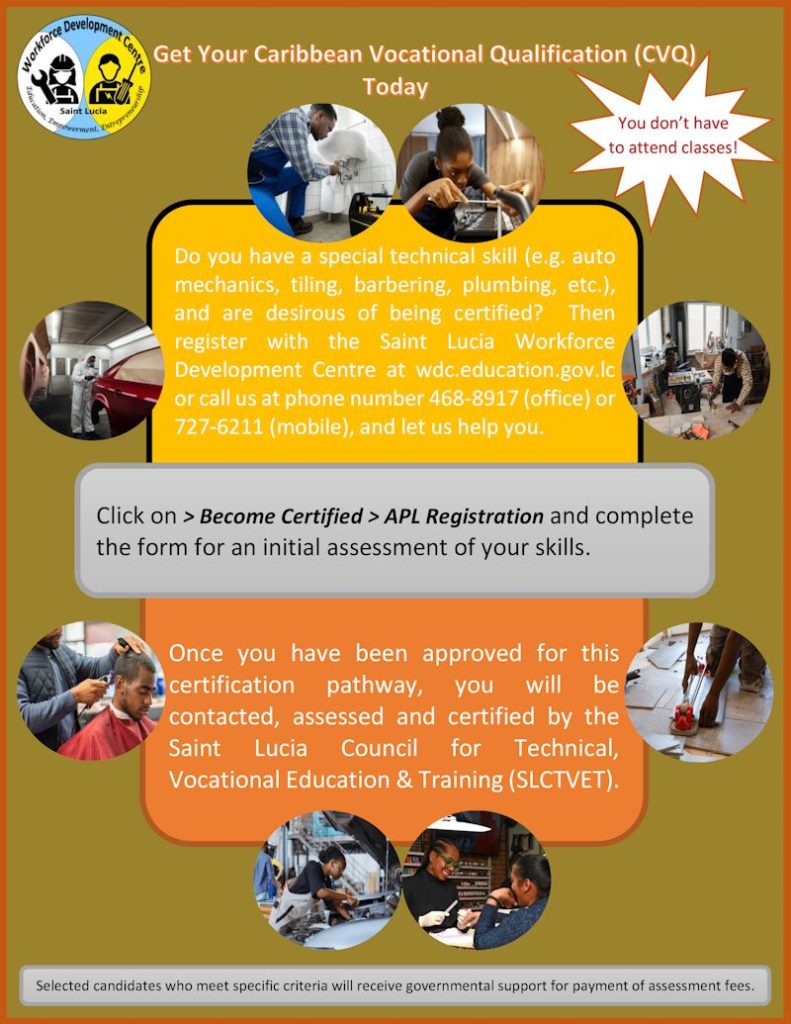 The poster below provides a brief outline of the the WDC’s Assessment of Prior Learning (APL) programme. Go through it and if you have any questions call call us at the numbers provided or email us at office.wdc@learning.edu.lc. Click Here To Register for the APL Programme.